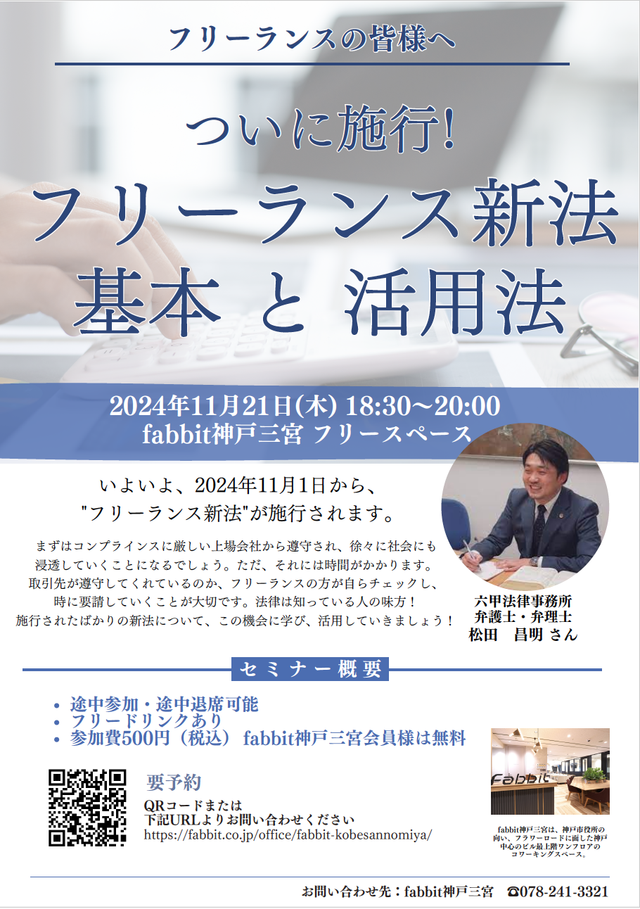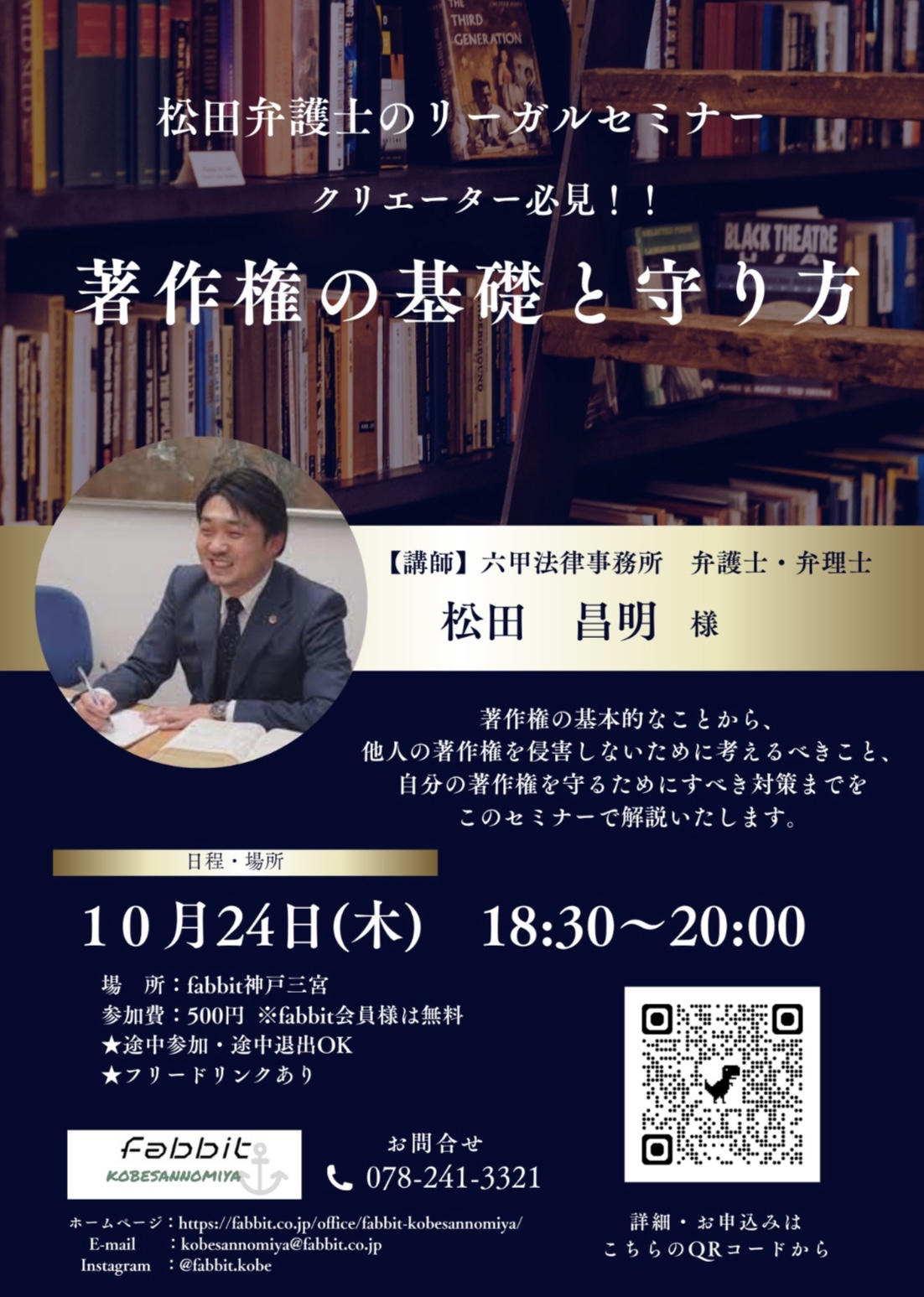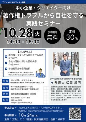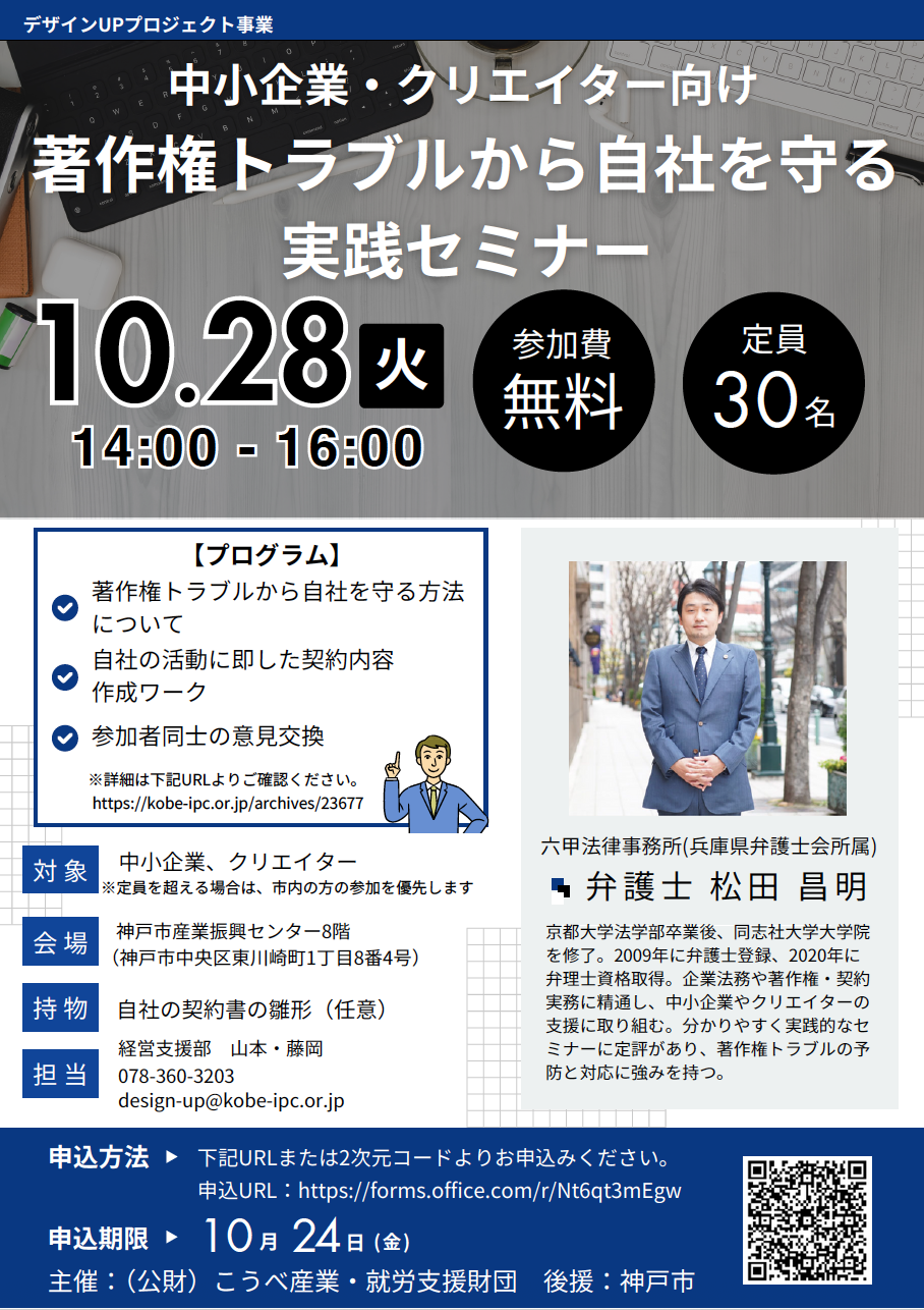 中小企業・クリエイターを対象に、著作権の基本から実務に役立つ契約のポイントまでを学べる実践セミナーを開催します。 講師は、著作権分野に精通した弁護士・松田昌明氏。実際の契約書作成ワークや参加者同士の意見交換もあり、すぐに使える知識が満載です!